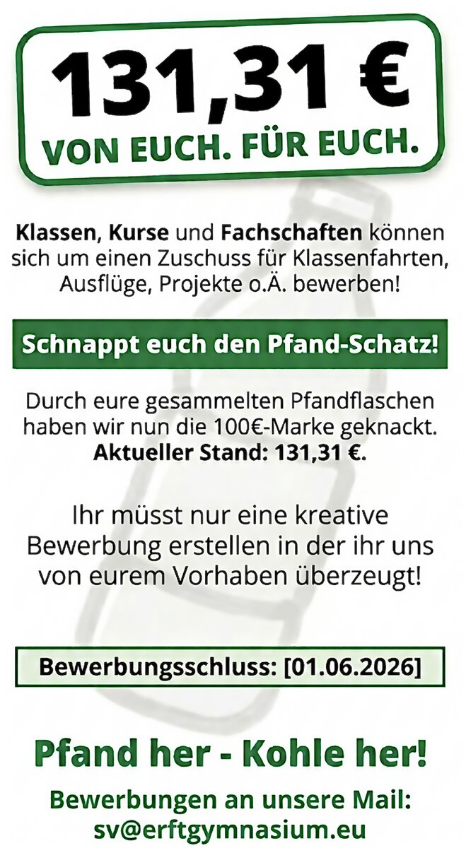 Ausgehend von der Idee der Schülervertretung (SV), gestalteten 4 Schülerinnen aus der 12. Klasse des Erftgymnasiums Bergheim in der Projektwoche vor den Herbstferien die Pfandflaschen-Sammelmülltonne. Diese Mülltonne gibt den Schülerinnen und Schülern und auch den Lehrerinnen und Lehrern die Möglichkeit Pfandflaschen in diese Mülltonne zu werfen und damit zu spenden. Zusätzlich wurden für jede Klasse einzelne Klassensammelbeutel entworfen, so dass direkt in den Klassen das Sammeln beginnen kann. Eine sinnvolle Möglichkeit die Pfandflaschen zu sammeln, statt sie schlimmstenfalls im Müll oder in der Natur zu entsorgen.